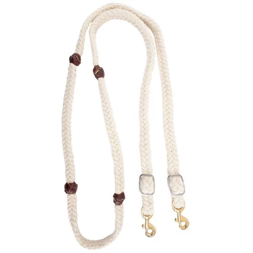Mohair Blended Barrel Rein from Martin Saddlery Barrel Rein is a flat 5- plait rein with latigo leather knots. Very comfortable in hand, the 5/8″ wide barrel rein has quality stainless steel conway buckles and brass snaps. The combination of the white mohair blend and latigo knots is very striking. From Martin Saddlery.