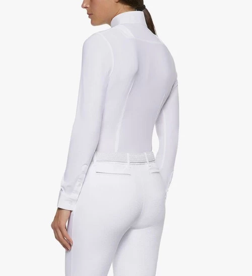 Cavalleria Toscana American Long Sleeve Show Shirt for women delivers a clean, elegant look for the American hunter show ring and high performance comfort. Beautiful Long Sleeve Show Shirt from Cavalleria Toscana has a standing collar with white bib front to give a classic look under a hunt coat. The covered quarter placket has button closures and snap collar. A low key CT logo is moved down the front of the shirt so it won’t show when wearing a jacket.