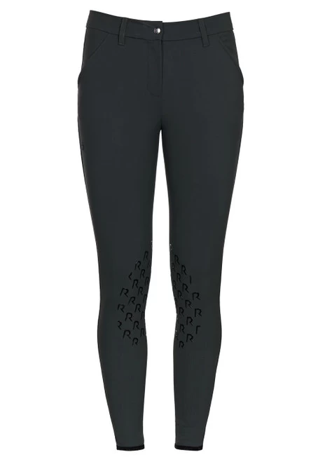 Cavalleria Toscana Revolution Knee-hi Perforated Mid Rise Knee Patch Breech has a lower leg with micro perforations that increase ventilation. The look is very subtle and won’t be see-through if you aren’t wearing your tall boots. Women’s Cavalleria Toscana equestrian riding pants have silicone print knees in the R for Revolution brand pattern. The silicone grip provides the rider with flexible security in the saddle. CT technical 4-way stretch fabric manages moisture, prevents odor formation, and has UV protection. The Cavalleria Toscana Knee-hi Perforated Breeches with mid rise and silicone knee grip are designed and made in Italy.