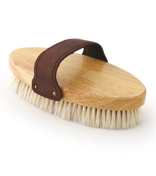 This 7 1/2 inch wooden oval body Decker brush sports a leather strap and extra soft goat hair bristles to leave your horse with a beautiful, finished shine. Really nice looking brush! The hand strap is softly padded inside and is stitched for durability. The bristles are the softest you can imagine!