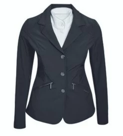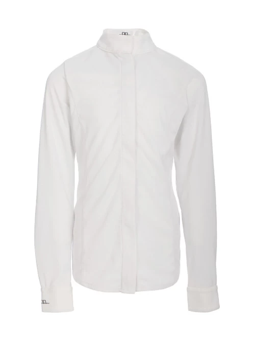 Horseware AA Girls Kara CleanCool Shirt is a long sleeve equestrian show shirt for girls with a modern low profile wrap collar and covered full length zipper. The luxurious hunter jumper show shirt from the Horseware Alessandro Albanese collection is made with a technical fabric called CleanCool. This innovative fabric with silver ion is breathable, wicking, sun protective, and cooling for hot weather competition. It has a slight texture to the soft knit that adds to the high end look.