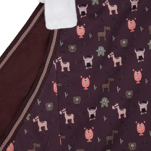 Horze Monster Pony Turnout fleece lined sheet has an adorable print as well as waterproof, breathable comfort for your pony. The repeating print of cute, whimsical monsters is fresh and fun. The color is a beautiful Fig Purple with accent trim. This pony rug does not have insulation, but the fleece lining is ideal for lightweight warmth.