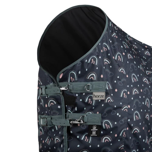 The Pony Trixi Rain Sheet lets your pony move comfortably while he stays cozy and dry. It is easy to put on and take off thanks to the front buckles with snaps at the chest. There are two low cross belly surcingles plus adjustable elastic leg straps to keep the blanket in place. Horze Equestrian Trixi Pony Rain Sheet is lightweight yet durable with the great features you want at a nice low price. The cheerful rainbows and raindrops print on navy is cute, too!