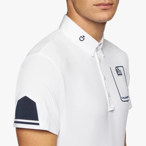 Cavalleria Toscana Men’s Team Daytona Polo is a short sleeve competition shirt with cool, soft pique fabric for riding comfort. Luxury Team Daytona Competition Polo from Cavalleria Toscana is made with a silky technical fabric that wicks moisture, dries rapidly, and is antimicrobial for long lasting freshness. The soft and stretchy material is easy to tuck into breeches without bulk or bunching. Men’s jumping show shirt has a four-button cotton poplin placket with tie loop and crisp white snap-down collar.