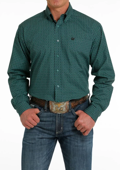 Guys can’t go wrong with the Men’s Cinch Teal Foulard Print Shirt with button-down collar and classic style. Men’s long sleeve Western shirt from Cinch is designed for hard working ranchers, competitors, and everyday riders and workers who want to look sharp and be comfortable all day. The teal color with neat foulard print looks great anywhere you go.