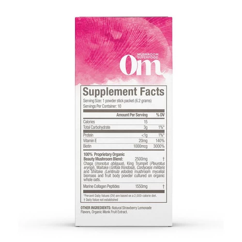 Also available in the Om Beauty+ formula that includes Biotin. Om Beauty+ comes in either a 10pack of drink sticks the Beauty-Full capsules.