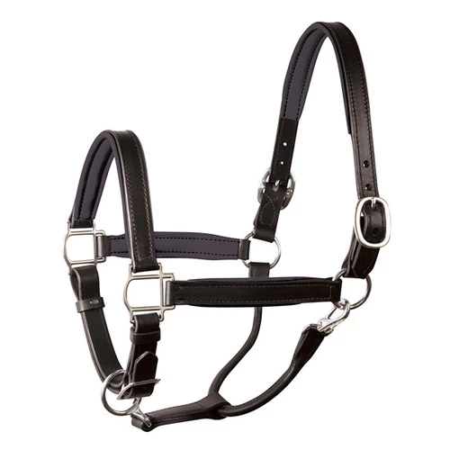 Perri’s Padded Leather Halter is an Amish-made double stitched 1″ black leather halter with contrasting soft black leather padding. This truly beautiful leather horse halter boasts fine quality at a great price. Padded halter has a 1″ double buckle crown, adjustable chin strap, rolled throat and a convenient snap at throat. Black with Black Padding and stainless steel hardware. In Full, Oversize.
