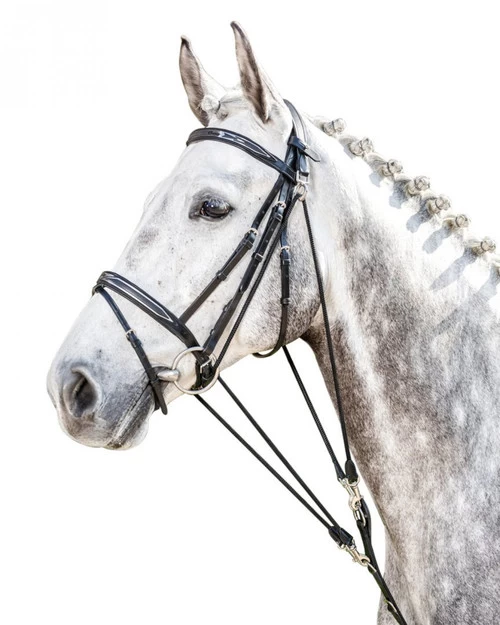 Prestige Leather Gogue offers an adjustable fit, durable performance, and a beautiful look with your bridle. The gogue, or de gogue, training device attaches to the bridle at the crown. The ropes are clipped to the center ring at the top of the chest strap. They are threaded through the crown then down the cheeks, and through the bit rings. The clip ends are then attached to one of 4 available rings on the chest strap. The other end of the chest strap attaches to the girth.