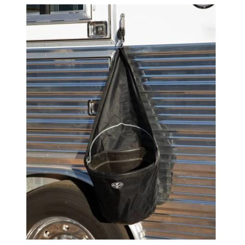The scratch-free Hanging Bucket Holder fits a standard 5-gallon water bucket. The whole bucket is inside the holder so the metal handle/hanger does not come in contact with the side of your trailer. The holder attaches easily to a steel tie mount or window bars. With 600D ripstop polyester, the Professional’s Choice Hanging Bucket Holder is durable for horse show use, trailering in, polo, and more.