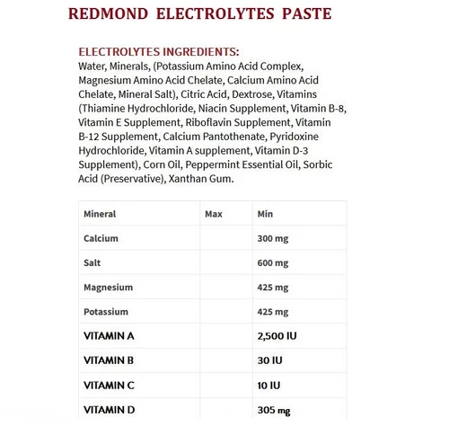 Redmond Electrolyte Paste helps keep your horse hydrated with a fast-acting targeted dose of critical electrolytes and vitamins. Horses love the Peppermint flavor so it’s easier to administer. Redmond Electrolyte Paste triggers your horse to drink more as it replenishes electrolytes lost due to heat, exercise, or nervousness.