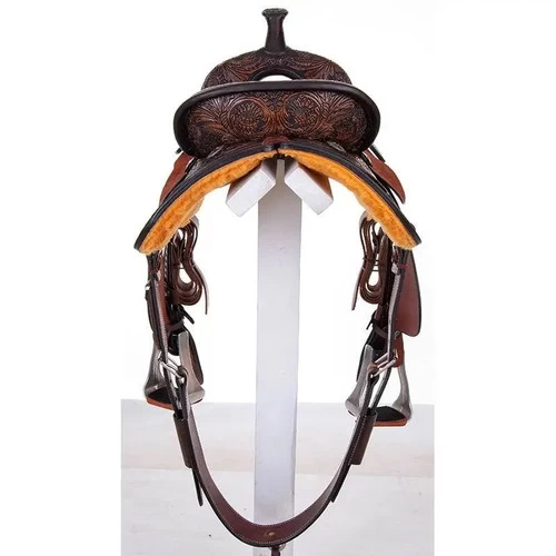 The 4212 Sharon Camarillo BRX Sleepy Sunflower 14.5″ has a hand-tooled sunflower pattern plus a combination of striking vintage finish and chestnut leather. The double skirted barrel saddle has a leg cut skirt for close contact that enables more precise cueing. A quilted, hand-stitched chocolate suede seat is secure and comfortable. Stylish Sleepy Sunflower Barrel Saddle is finished with Camarillo Signature hardware.