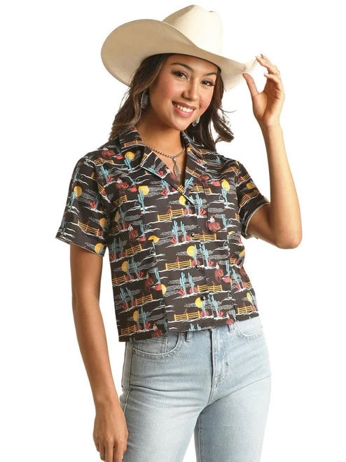 Rock & Roll Denim Retro Cactus Shirt is built for fun with a 4-snap front. The shorter length works really well with high rise jeans and shorts. Ladies Western top has patch pockets, a spread collar, and a unique print of desert scenery in blacklight shades. R&R Dale Brisby Retro Cactus casual cowgirl shirt has a bit of spandex and a roomy fit so you’ll definitely be ready to relax.