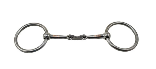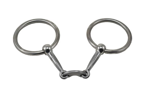 Tom Balding Dr Tom Loose Ring Bit is a western training bit with double jointed mouthpiece and center link that resembles a Dr. Bristol mouth. The Dr. Tom version has a unique curved shape that helps spread pressure across the tongue. The overall design allows wraparound pressure on the bars of the mouth. Dr. Tom Loose Ring Bit from Tom Balding is a transition bit, great for progressing a horse from snaffle to a curb. The loose ring bit is made with cold rolled steel, also called sweet iron. This metal is more porous than stainless steel, allowing the formation of rust. The harmless rust is tasty to the horse and encourages chewing and salivating.