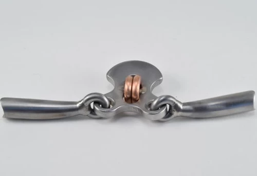 Tom Balding Short Shank Double Cross Bit makes a great transition bit for a young horse, helping him drop the nose and prevent pushing out. Works well for a horse moving out of a snaffle that needs some correction but has a soft mouth. Western shank bit from the Tom Balding Baseline collection is hand crafted using sweet iron (steel) with an attractive satin finish. The Double Cross mouthpiece combined with the 6 3/4″ shanks makes a nice bit to prepare a horse for the bridle. The Double Cross mouthpiece is double jointed with a flat, longer center link that adds tongue pressure. The addition of copper rollers encourages salivation to keep the bit functioning properly and increase bit acceptance. Tom Balding Short Shank Double Cross Bit is sized at 5 1/8″ to fit most horses and has comfortable no-pinch bit ends.