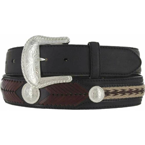 Handsome Tony Lama The Duke Belt for men has leather laced chevron design with engraved silver conchos in the center. Horsehair accents and a large silver buckle make this a traditional favorite Western style belt with Mary’s customers. Men’s belt has a beautifully engraved silver buckle and wonderful attention to detail. Pair it with your favorite jeans for a great look in the show pen. Distinctive men’s The Duke Western riding belt has classic cowboy looks and impressive style.