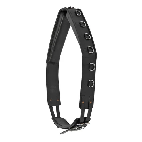 Waldhausen Leather Lunging Surcingle is versatile training tack for use when lunging your horse. Horse training surcingle features softly padded leather and 12 stainless steel rings for lots of options. Black. Horse/Full size: the length from top billet hole to top billet hole, along the inside (the portion that would lay across the horse’s back) is about 60″. The girth it comes with is about 15″, buckle to buckle.