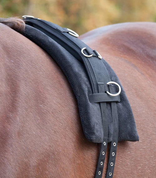 The Memory Foam Surcingle Pad from Waldhausen assures greater comfort for your horse during lunging or vaulting practice. This soft memory foam padding will adapt to each horse’s shape to create a perfect fit. The upper surface is slightly gummed so it will not slip under the surcingle. The surcingle pad has velcro tape attachment to keep it in place. The Waldhausen Memory Foam Surcingle Pad is breathable, soft, and cushioning. The product photo shows the pad used with a lunging surcingle. All surcingles and other accessories are sold separately. The Surcingle Pad is the pad only. Available in Black.