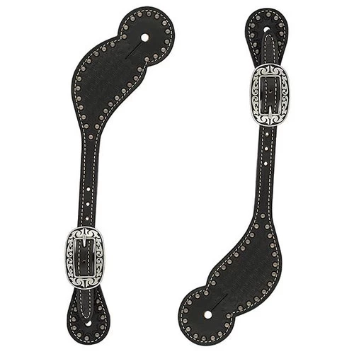 Weaver Basketweave Floral Regular Spur Straps are here in Chestnut or Black fine English bridle leather. Regular style Western spur straps from Weaver Leather feature basketweave embossing and are edged with pewter spots. Classy and elegant shaped stainless steel hardware has floral engraving with black accent. Western spur straps from Weaver are available in chestnut brown or black.